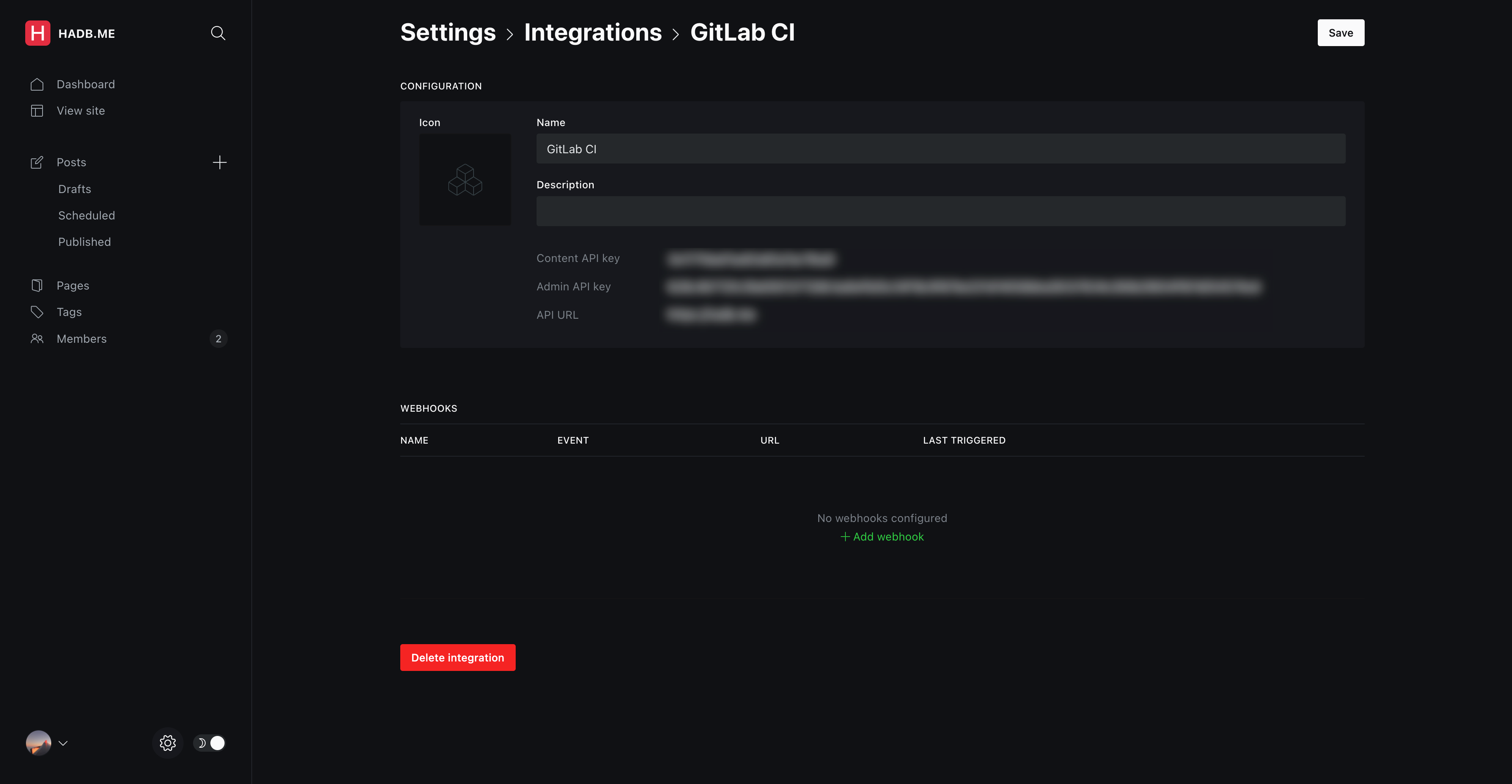 首先,我们也需要去 Ghost 后台创建一个自定义的 Integration,比如取名叫 GitLab CI,目的是为了获得 Admin API key 和 API URL,后面在 GitLab CI 中需要用到。